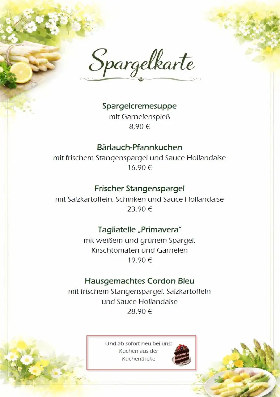 Ob klassisch mit Salzkartoffeln, Schinken und Sauce Hollandaise, als cremige Suppe mit Garnelenspieß oder in unseren Tagliatelle „Primavera“.