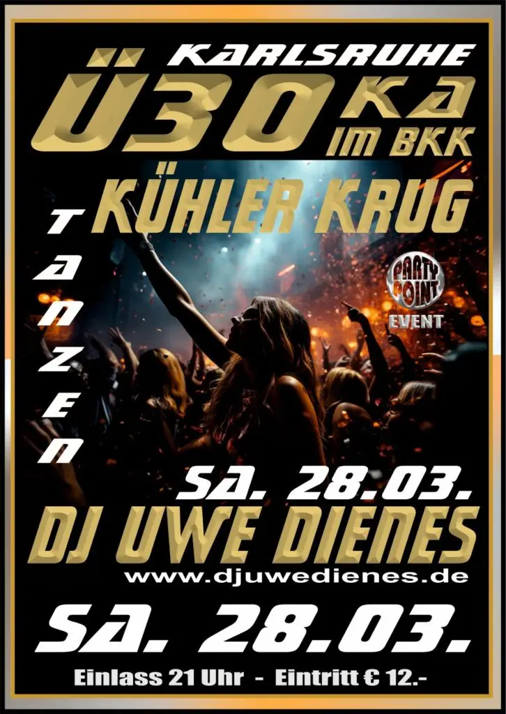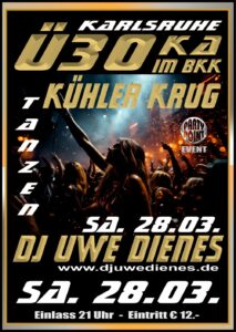 Am Samstag, 28.03., erwartet euch im BKK / Kühler Krug Karlsruhe eine stimmungsvolle Ü30-Party mit bester Musik und echter Partynacht-Atmosphäre. DJ Uwe Dienes sorgt für den passenden Sound und eine volle Tanzfläche.
